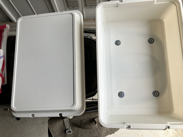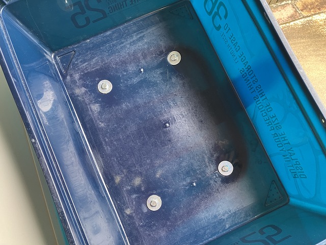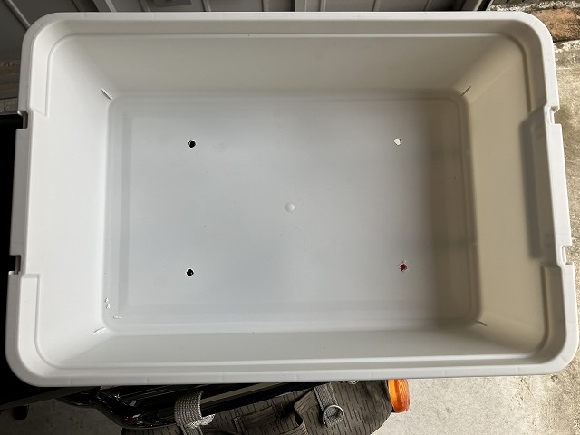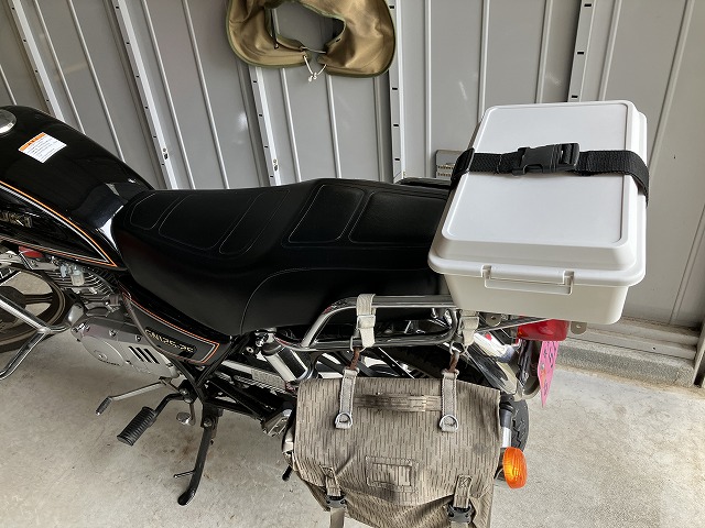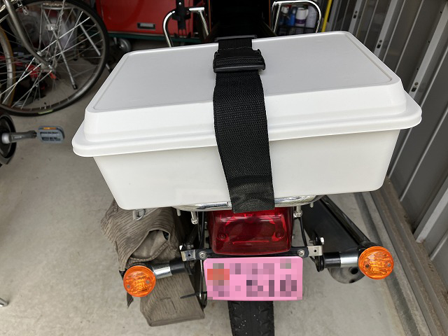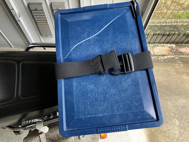 「環境にやさしいコンテナボックス」にはラッチが付いているので、バイクの走行中にフタが外れることはないかと思いますが、念のため以前と同じようにベルトを付けました。